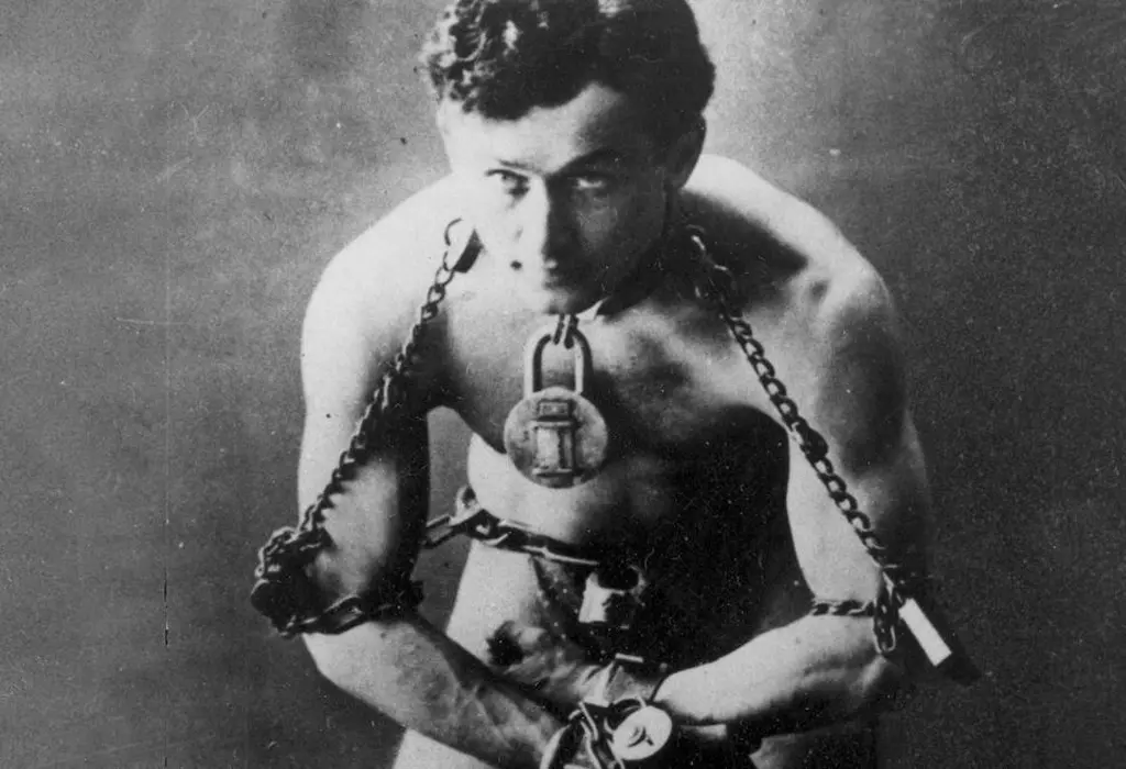 „Cu susul în jos.” Numărul emblematic al lui Houdini era aproape la fel de uluitor de privit pe cât era de dificil de executat. O replică de birou a celebrei sale celule de tortură cu apă recreează enigma printr-o teatralitate clasică, de altădată.